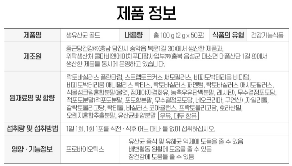 많은 분들이 드시고 계실 것으로 생각되는 종근당 락토핏의 제품 정보를 가져와봤는데요. 락토핏의 경우에도 '섭취량 및 섭취방법'이 기재되어 있습니다. 섭취하기 전에 이를 꼭 확인하고 따라 주셔야 안전하게 섭취할 수 있고, 기대하는 효과를 최대한 보실 수 있답니다. 그리고 추가로 위에 '원재료명 및 함량' 보시면 [우유, 대두 함유] 보이시죠? 이 역시 앞서 말씀드린 것처럼 알러지 유발원이 될 수 있기 때문에 정보를 제공한 것으로, 섭취 시 참고해야 할 사항 중 하나랍니다.