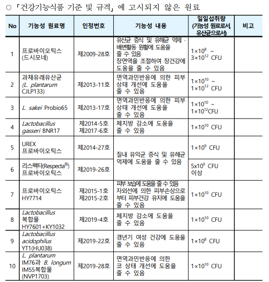 지난 번 체지방 감소 유산균 때 말씀드렸던 것처럼, '유산균'하면 보통 장건강, 배변활동과 많이 연관 지으실 거예요. 유산균을 먹어서 질건강을 챙긴다? 생소한 개념이실 거라고 생각합니다. 2021년 7월 기준 식약처 보도참고자료에 따르면 개별인정형 원료인 유산균(또는 프로바이오틱스, 정확히 동의어는 아니지만 보통 함께 쓰는 용어들이죠.)이다음과 같다고 하는데요. 배변활동, 장건강, 체지방 감소 외에도 면역과민반응에 의한 피부상태 개선, 질내 유익균 증식 및 유해균 억제, 피부건강 유지, 갱년기 여성 건강 등 굉장히 다양한 기능성을 인정받았음을 확인할 수 있습니다.