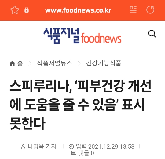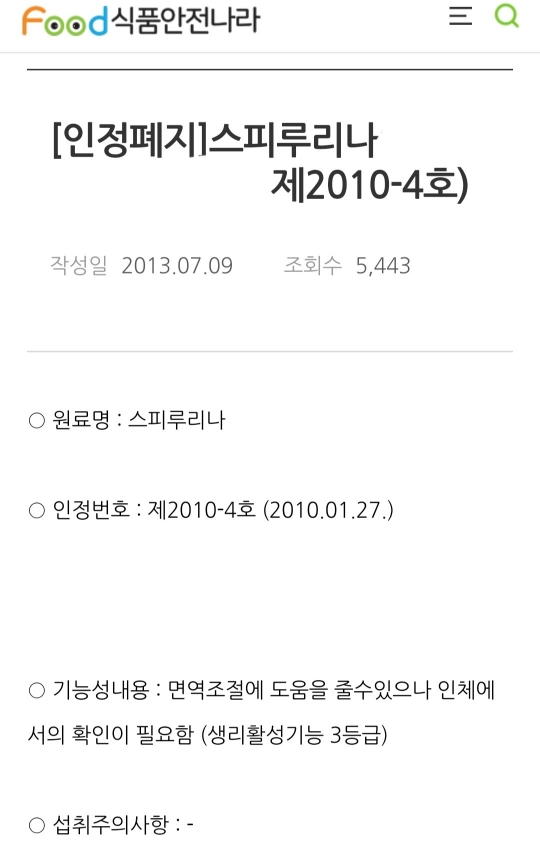 한편, 제목에서도 언급되어 있듯이 스피루리나의 피부건강 관련 기능성은 삭제가 되었는데요. 인체적용시험 자료가 부족하기 때문이라고 합니다. 앞서 말씀드렸듯, 예전에는 기능성을 획득하기 비교적 쉬웠다고 합니다. 2016년 이전에는 생리활성기능 등급 체계가 있어서 인체시험 자료가 부족하더라도 낮은 등급으로나마 인정을 받을 수 있었는데요. 생리활성기능 3등급의 경우 '~에 도움을 줄 수 있지만 관련 인체적용시험이 미흡함'의 등급으로, 현재는 이와 같은 수준의 자료를 제출한다면 기능성 원료로 인정받을 수 없답니다.. 스피루리나는 생리활성기능 3등급이었던 면역력 관련 기능성이 폐지된 적이 있었는데요. 이번 재평가를 통해 스피루리나는 항산화와 혈중 콜레스테롤 개선의 2개 기능성을 유지하게 되었습니다.