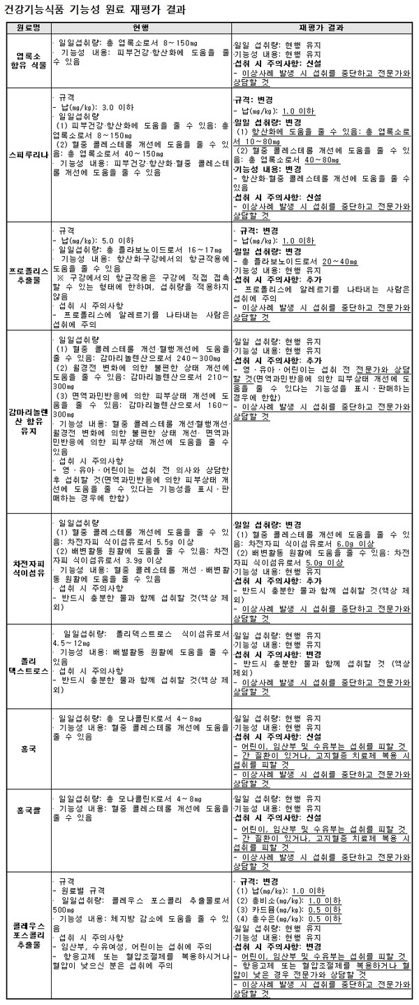+기사에 언급된 기능성 원료 재평가 결과는 다음과 같이 친절하게 정리되어 있으니, 전반적인 내용을 한번 살펴보시기 바랍니다.