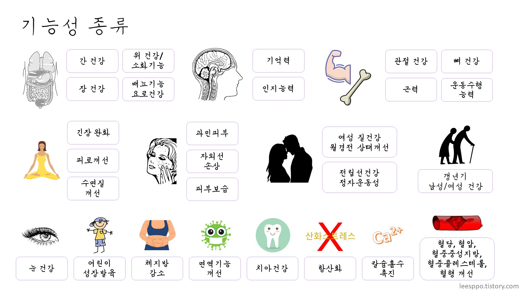 건기식에 들어있는 기능성 원료들은 어떤 효과가 있을까요? 원료들의 기능성은 현재 다음과 같이 인정되어 있습니다.