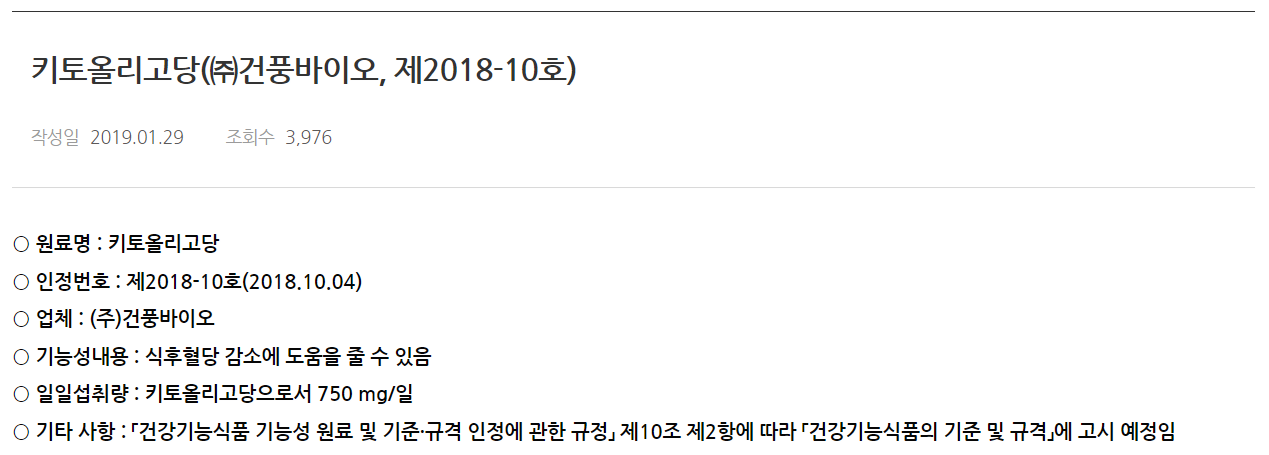 키토올리고당은 갑각류의 껍질이나 연체류의 뼈에서 얻은 키토산을 효소처리(분해) 하여 얻는 원료라고 합니다. 키토올리고당에 대한 기본적인 정보는 다음과 같습니다. 제가 보기에 조금 특이한 점이 있다면, '식후 혈당' 감소에 도움을 줄 수 있다는 기능성 내용입니다. 보통 혈당을 체크할 때 공복에 측정을 많이 하잖아요. 건강 검진할 때도 공복 상태로 채혈해서 여러 혈액 지표들을 확인하고요. 근데 키토올리고당은 '공복'이 아닌 '식후' 혈당 조절에 도움을 줄 수 있나 봐요.
