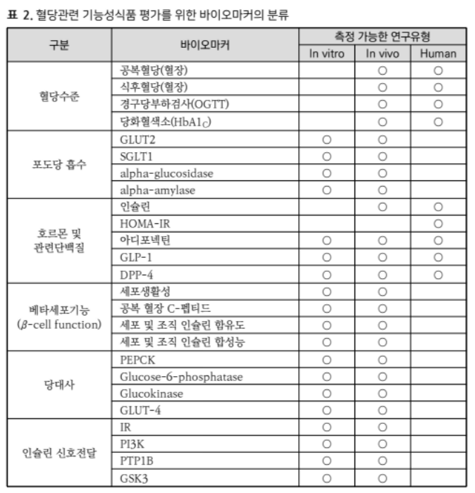 건강기능식품 기능성 평가 가이드 '혈당조절에 도움을 줄 수 있음' 편에 소개되어 있는 바이오마커는 다음과 같습니다.