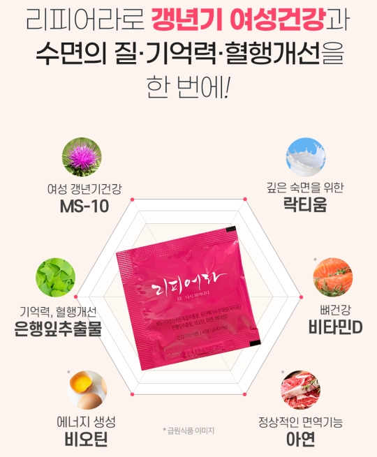 리피어라 광고를 보면 무엇보다 수면의 질이 개선된다는 점이 강조되고 있습니다. 앞서 훼라민 큐 포스팅에서 살펴보았던 것처럼, 갱년기의 여러 증상 중 불면증이 있는데요. 리피어라는 이를 개선하는 데 도움을 줄 수 있나 봐요. 제품의 상세페이지를 한번 찾아보았습니다.