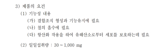 비타민C는 건강에 조금이라도 관심 있으신 분들이라면 너무나 잘 아실 거예요. 다음은 건기식 공전에 명시되어 있는 비타민 C에 대한 내용입니다.
