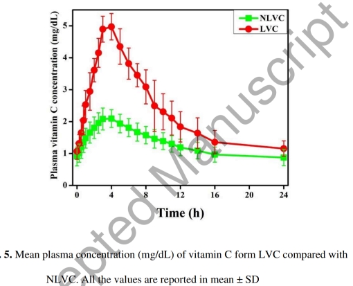 위 그래프에 따르면 리포좀 비타민 C(LVC)를 섭취했을 때 최대 혈중 비타민 C 농도도 2배 이상으로 높고, 그래프 아래 면적(AUC)도 넓어 생체이용률이 높다는 것을 알 수 있습니다.
